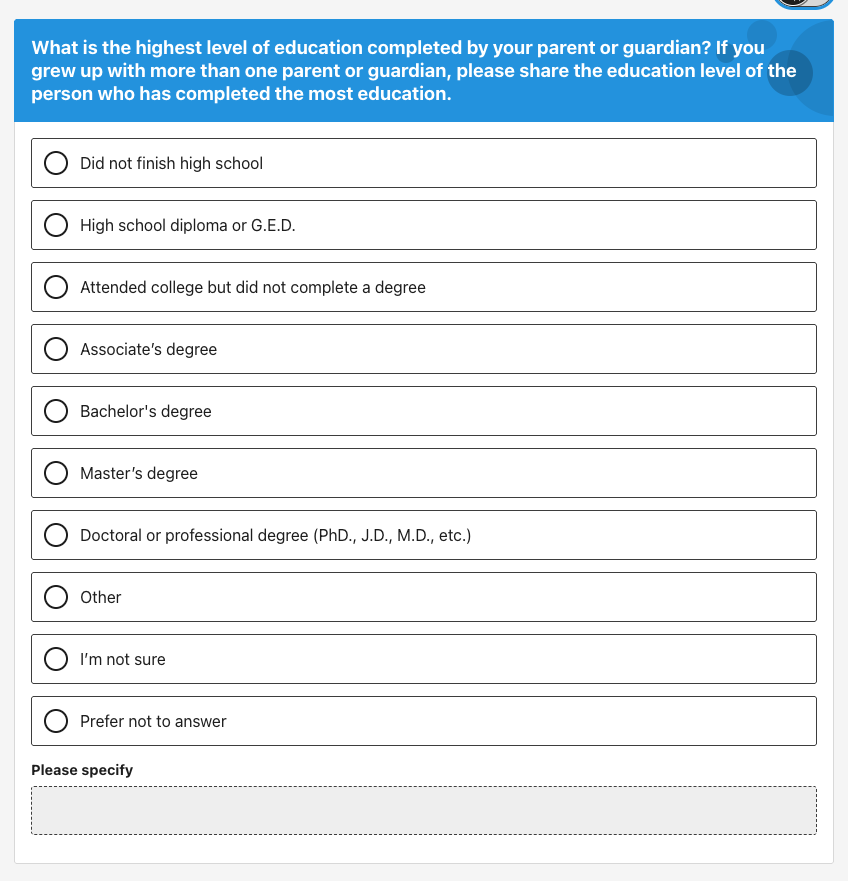 Participants who select “Other,” “I’m not sure,” “Prefer not to answer,” or skip the question are categorized as “skipped question” in reports.